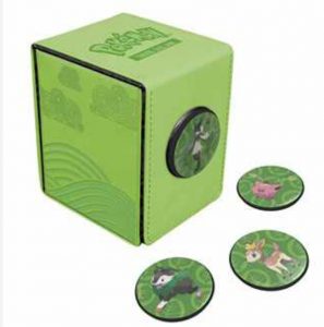 Collect, store, and personalize with the Alcove Click for Pokémon! The Alcove Click Deck Box includes four interchangeable badges featuring grass-type Pokémon Skiddo, Hoppip, Deerling (Spring Form), and Meowscarada. This Deck Box holds up to 100 standard-size trading cards double-sleeved in Ultra PRO Deck Protector® sleeves, features a strong magnetic closure, and has dual thumb notches for easy access to your deck. Personalize your Alcove Click by customizing with your favorite 1.5 in. magnetic Pokémon badge!