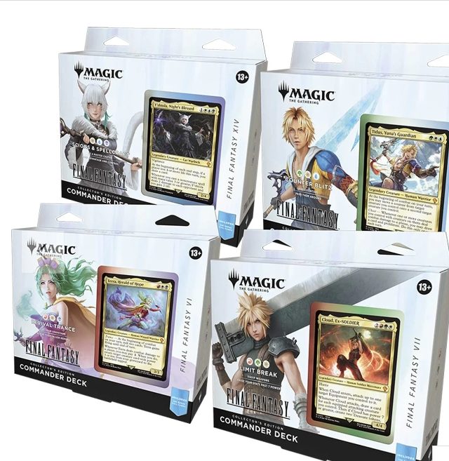 Battle your friends with FINAL FANTASY’s iconic heroes, villains, and spells in Commander, Magic’s most popular multiplayer format. This bundle includes all four Magic: The Gathering—FINAL FANTASY decks, each featuring cards themed around a different FINAL FANTASY game—Revival Trance (FINAL FANTASY VI), Limit Break (FINAL FANTASY VII), Counter Blitz (FINAL FANTASY X), and Scions & Spellcraft (FINAL FANTASY XIV). Land cards may appear from other FINAL FANTASY games.